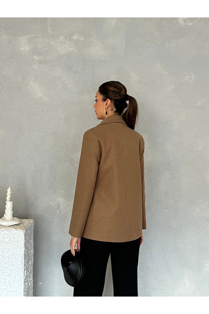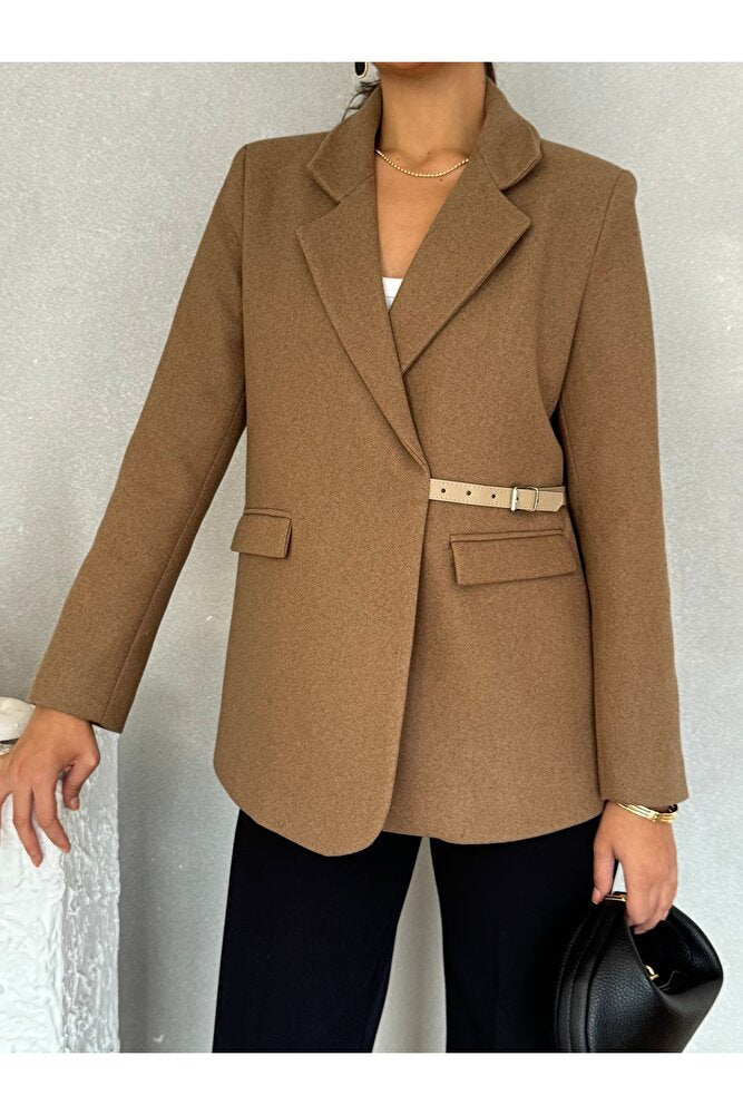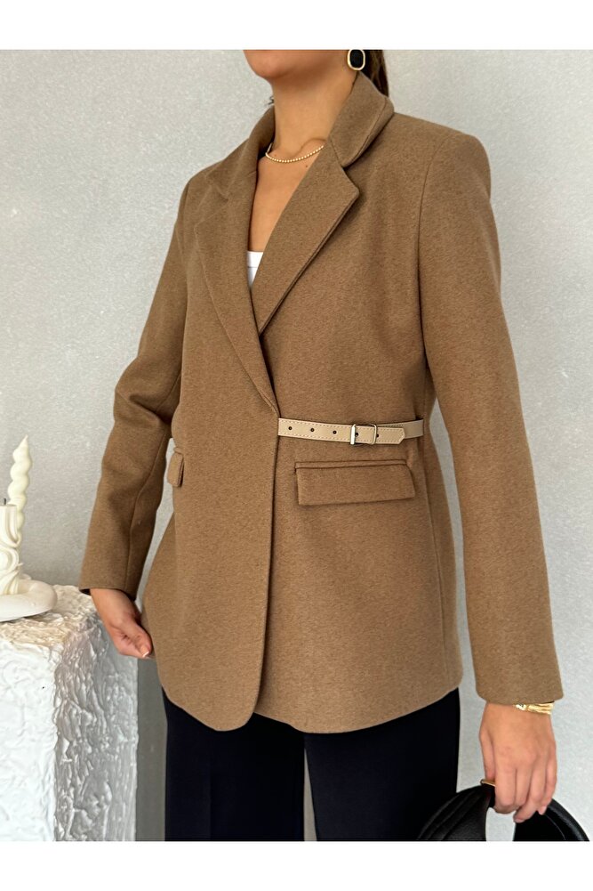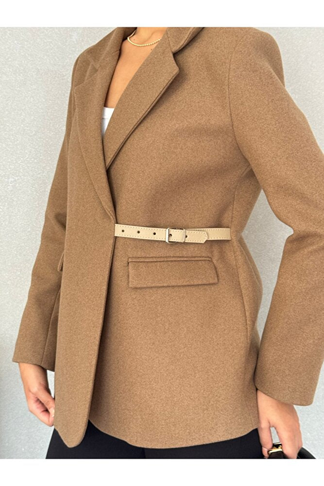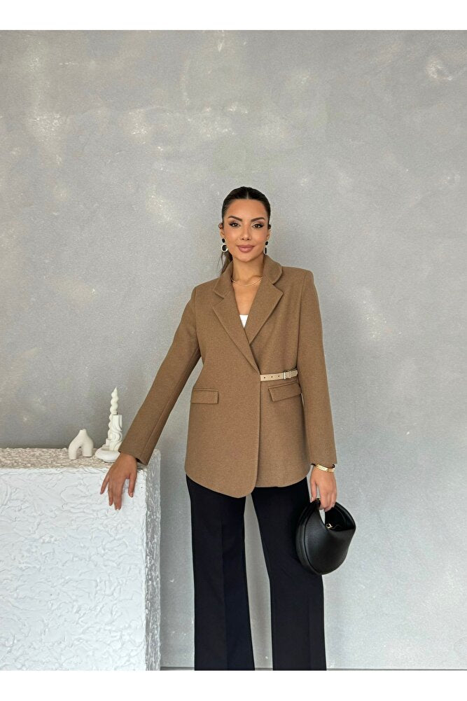 Yandan Kemer Detaylı Astarlı Kısa Kaşe Leya Ceket