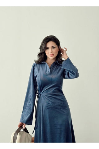 Kadife Yandan Bağlamalı Yarım Pat Düğmeli Özel Gün Günlük Uzun Boy Kadın Elbise