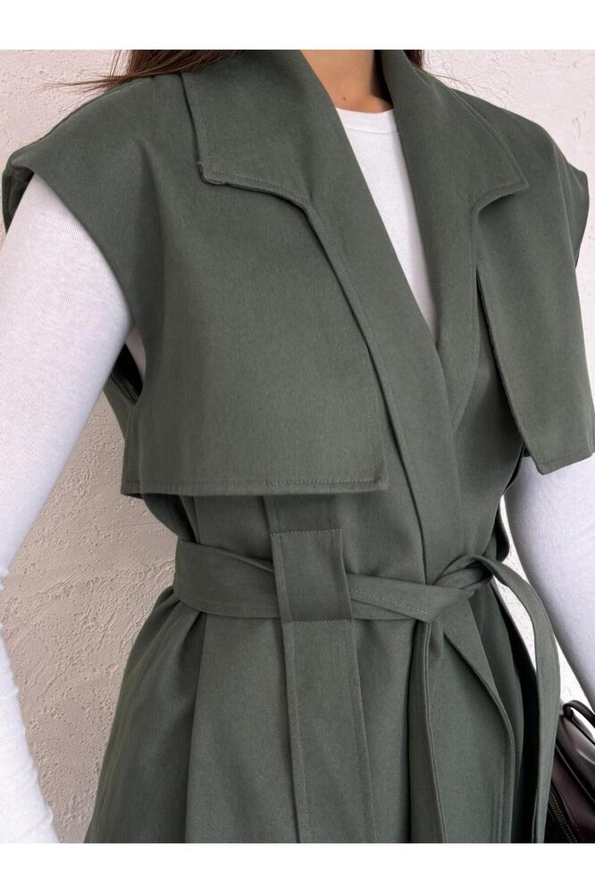 Rüzgarlık Detaylı Kuşaklı Kolsuz Kadın Şık Klasik Günlük Nişan Düğün Pantolon Yelek Takım