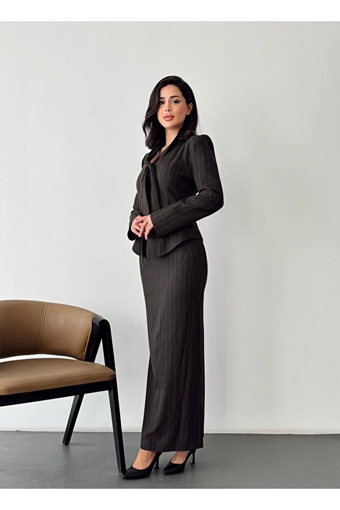 Çizgili Vatkalı Astarlı Boyun Aksesuarlı Ceket Etekli Kadın Özel Gün Günlük İkili Takım